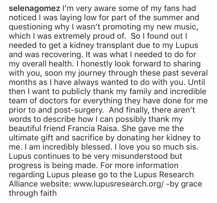 So, to Selena: thank you so much for sharing your struggle. I know how hard it is. Thank you for being a voice, and a face, to millions of us who suffer with an invisible disease.