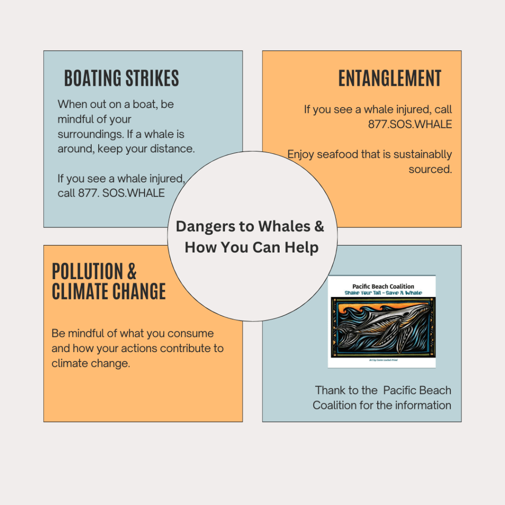 How can you help? While out on a boat be mindful of your surroundings making notes of any whales. If you see a whale, stay away from it at a safe distance.